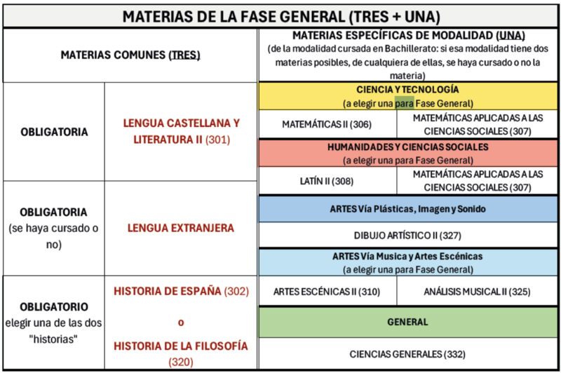 Consta de cuatro exámenes que se corresponden con tres de las cuatro materias comunes de 2º de Bachillerato (dentro de ellas se elige una de las lenguas extranjeras, SE HAYA CURSADO O NO), y se ha de optar además entre Historia de España e Historia de la Filosofía) y la específica escogida para la prueba de la modalidad cursada (AUNQUE LA MATERIA EN CONCRETO NO SE HAYA CURSADO), según el esquema siguiente: