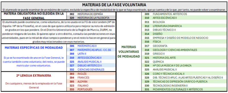 Cuando se realicen en la misma convocatoria ambas fases, General y Voluntaria, la materia de modalidad de la Fase General no se podrá incluir en la Fase Voluntaria, pero la nota obtenida se valorará en los procesos de admisión1 .