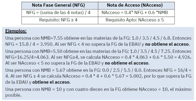 - Una persona con NMB=5.50 obtiene en las materias de la FG: 1.0 / 3.5 / 4.5 / 7.25. Entonces NFG=16.25/4=4.063. Al ser NFG≥4, se calcula NAcceso = 0.4 * 4.063 + 0.6 * 5.50 = 4.926. Al ser NAcceso < 5 no supera la FG de la EBAU y no obtiene el acceso.
